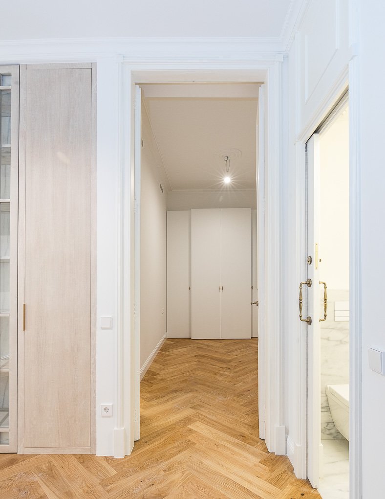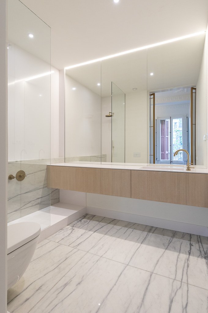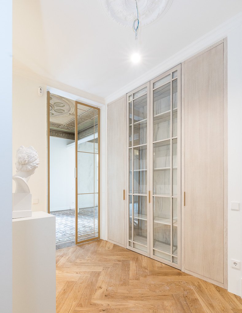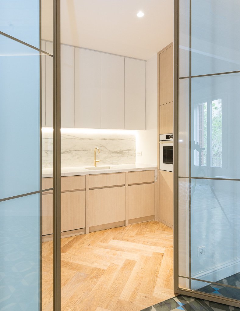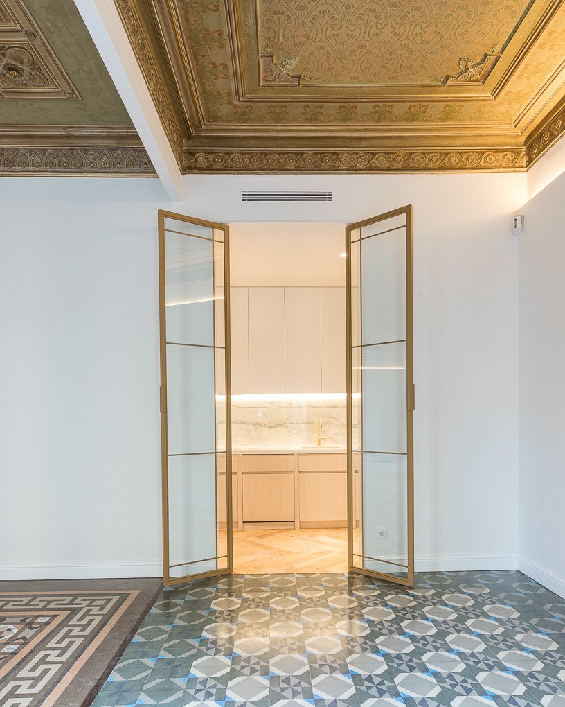 En esta finca modernista del Eixample Derecho, la luz se convierte en protagonista gracias a la creación de verrières doradas que permiten su filtrado hasta el núcleo de la vivienda. La intervención combina el respeto absoluto por la identidad del edificio —conservando molduras, carpinterías y suelos de noia— con soluciones contemporáneas que dotan al espacio de calidez, funcionalidad y sofisticación. Este proyecto es una celebración del patrimonio modernista adaptado a las necesidades de la vida actual.